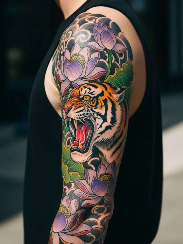This half sleeve tattoo combines a roaring neo traditional tiger with soft lavender lotus flowers. The composition flows from the shoulder down the arm with swirling background shapes that frame the tiger’s face. The bright orange fur contrasts beautifully against the cool purples and greens of the lotus petals. Everything is bold and clean with strong outlines and a vibrant color palette that feels full of life.