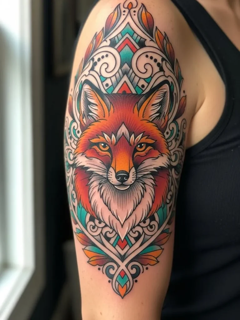 This neo traditional half sleeve shows a bright orange fox centered within an ornate geometric frame. The tattoo sits perfectly on the upper arm and extends from the shoulder cap down in a long, elegant shape. Shades of teal, cream and warm red flow through the filigree patterns while the fox itself feels expressive and lively. The clean lines and bold colors make the whole design stand out like a mini mural.
