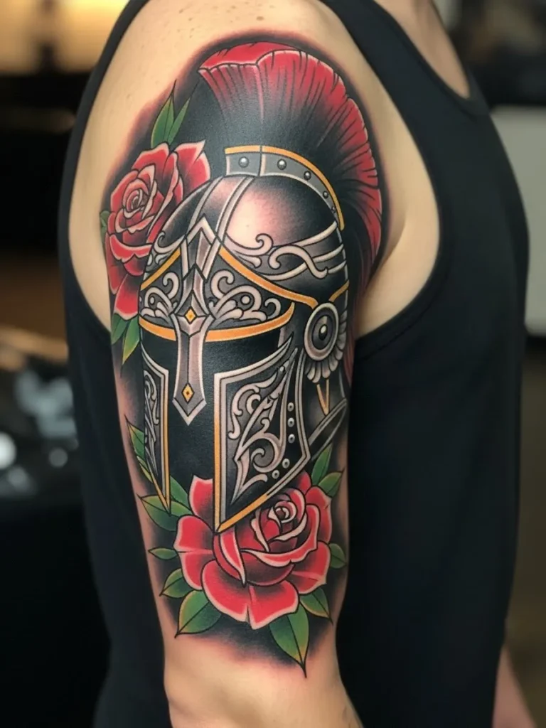This half sleeve tattoo features a bold Spartan style helmet framed with vivid red roses across the upper arm. The neo traditional detailing on the helmet creates depth with soft grey shading and crisp gold accents that highlight each ornate swirl. The roses sit at the top and bottom of the piece which gives the whole tattoo a beautiful balance of strength and softness. The placement follows the curve of the shoulder and creates a striking vertical composition.