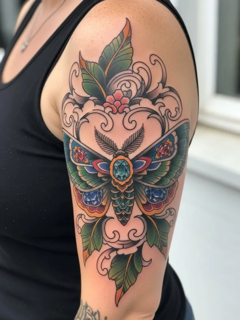 This half sleeve tattoo shows a large jewel toned moth with wings that open gracefully across the upper arm. The colors move through rich greens blues and warm oranges while gem like shapes add shine to the wings. Soft scrollwork fills the space around the moth along with leafy details that make the tattoo feel full and decorative. Everything is outlined cleanly which keeps the design bold and eye catching from every angle.