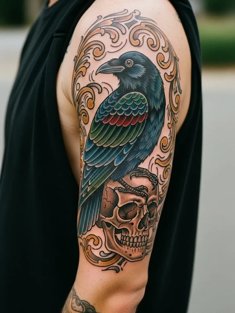 This half sleeve tattoo features a dark beautiful crow perched confidently on a cracked skull. The feathers shift from deep blues to earthy greens which creates a subtle glow against the skin. Swirling neo traditional scrolls frame the top and bottom of the piece and add warmth with gold and brown tones. The placement fills the upper arm perfectly and the vertical flow makes the whole tattoo feel composed and dramatic.
