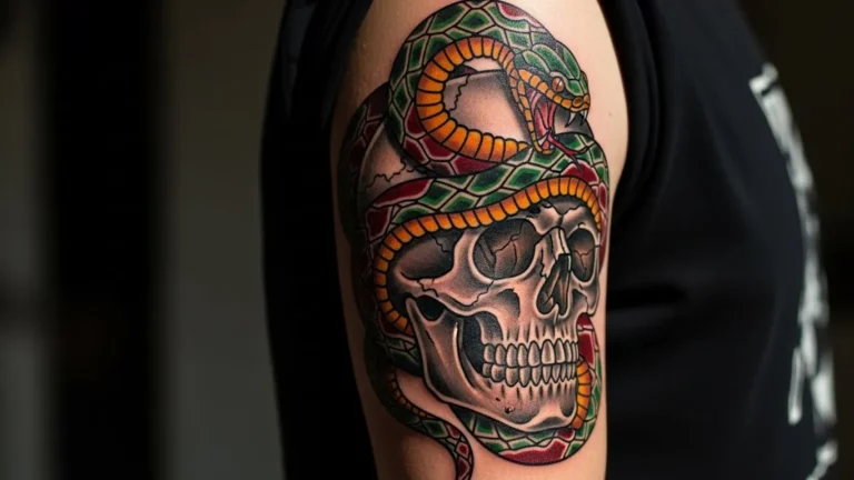I think this tattoo draws attention because the movement of the snake feels so alive. The way it loops around the skull adds this storybook feeling of danger and mystery. I also love the contrast between the warm and cool tones because it gives the whole tattoo so much personality without feeling too heavy.