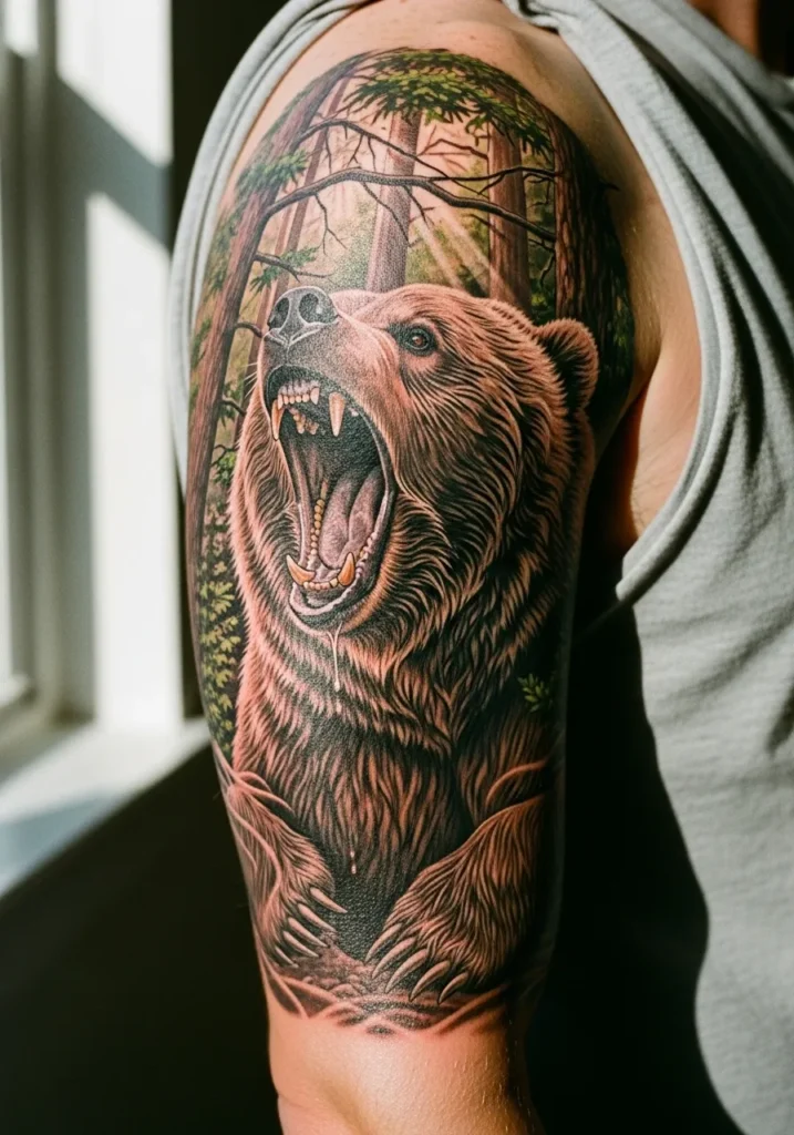 This tattoo covers the upper arm with a powerful image of a roaring bear surrounded by tall forest trees. The sunlight streaming through the branches adds depth and warmth to the realistic fur details, creating a dramatic yet natural look. The earthy tones bring the entire piece to life with incredible realism.