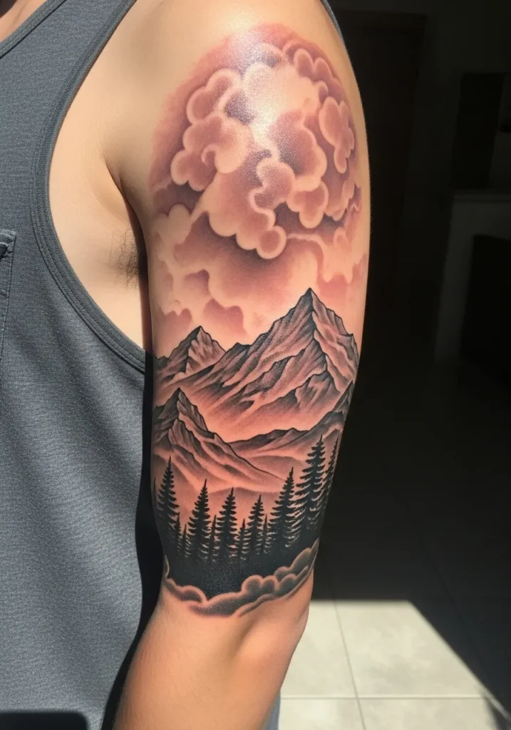 This half sleeve features a scenic mountain range under glowing pink skies, fading into layers of dark pine trees below. The shading transitions beautifully from soft clouds to sharp ridgelines, giving the whole design depth and movement. It’s a calm yet bold piece that wraps naturally around the arm.