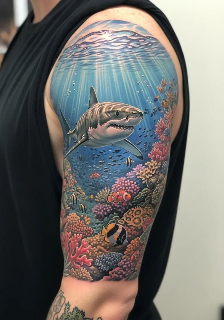 This half sleeve tattoo bursts with color and life. A great white shark swims among coral reefs filled with clownfish, anemones, and shimmering details. The soft blue water above transitions to vibrant coral below, creating a perfect balance of realism and color harmony.