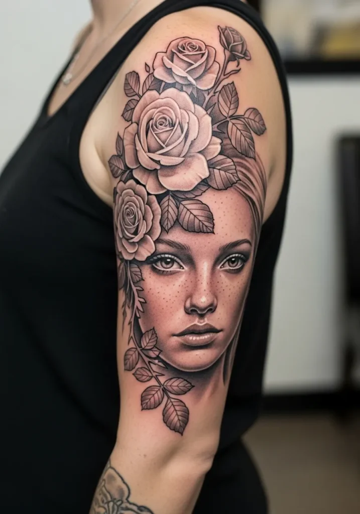 A delicate portrait of a woman with soft freckles and a calm gaze anchors this black and grey realism tattoo. Surrounding her are intricately shaded roses that flow down the arm, creating harmony between natural beauty and fine detail.