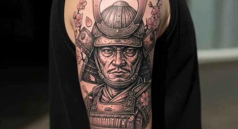 This half sleeve captures the fierce intensity of a samurai, surrounded by pink cherry blossoms for a touch of contrast. The detailed armor and stern expression give it incredible presence, while the soft petals add beauty to the strength. Every stroke of shading enhances the depth and realism of the portrait.