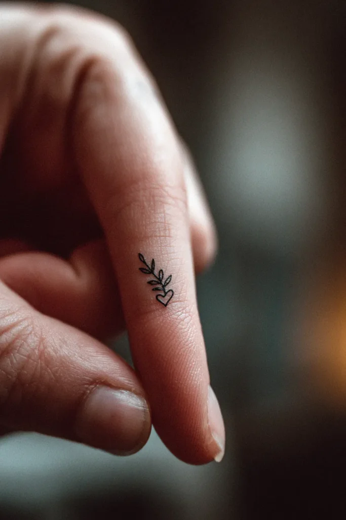This is a very small fine line tattoo placed delicately on the side of the finger, showing a minimal heart with a subtle leafy branch detail. The black ink is clean and crisp, and the scale makes it feel almost like a personal secret rather than a statement piece. Its simplicity is what makes it so charming and intimate.