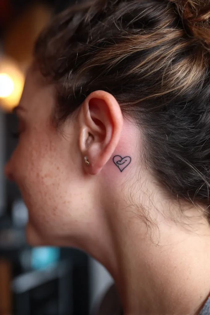 This tattoo sits just behind the ear, featuring a small fine line heart drawn with smooth, slightly imperfect lines that add warmth to the design. The placement is discreet yet thoughtful, and the black ink contrasts softly against the skin. Its size and location make it easy to hide or show depending on the moment.