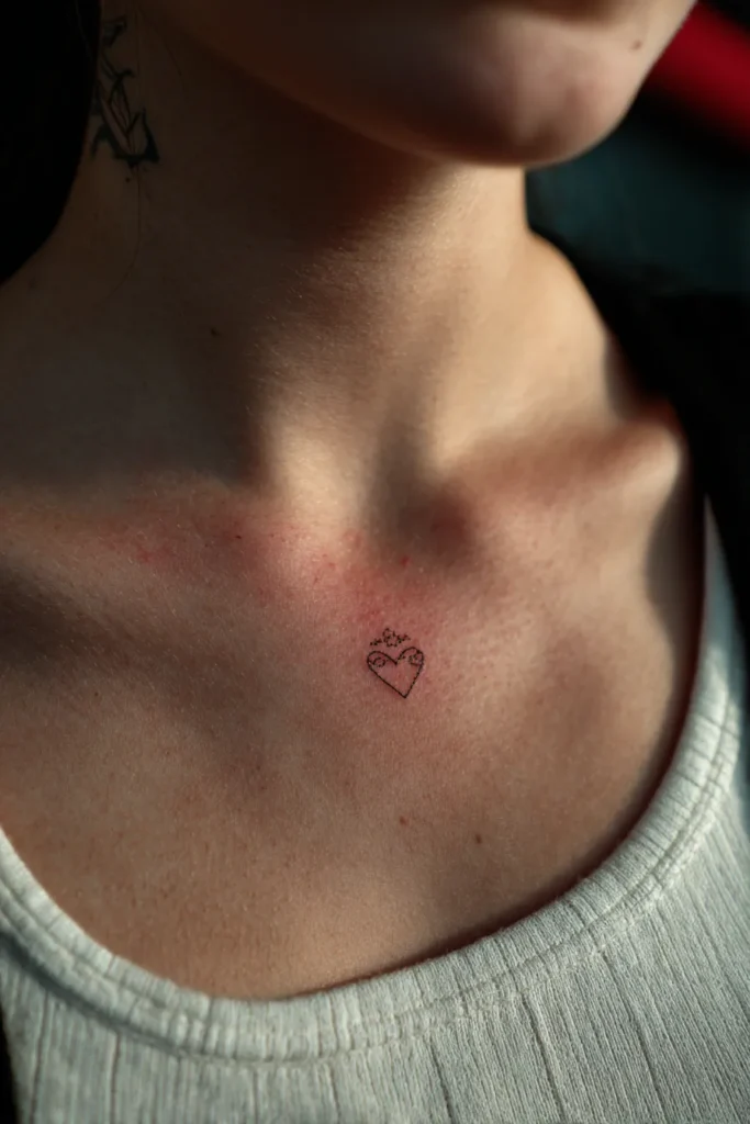 This tattoo sits right at the center of the collarbone and feels incredibly delicate and intentional. The design is a very small fine line heart with a subtle sacred detail inside, done in soft black ink with light redness around it that gives it that fresh realistic look. Its size keeps it understated, and the placement makes it feel almost like a personal secret resting close to the heart.