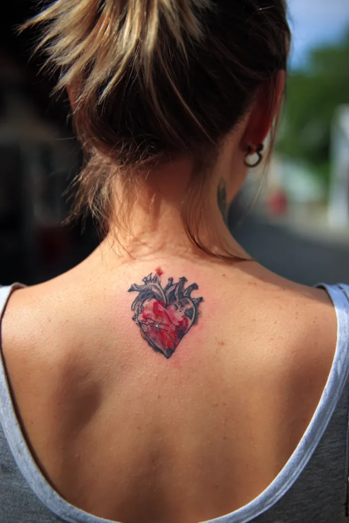 Placed high on the upper back just below the neck, this tattoo features an anatomical heart rendered in a realistic style. The shading blends soft blacks with muted reds, giving it depth and an almost hand drawn realism. Slight redness around the ink adds to the freshly done look and makes the design feel raw and honest.