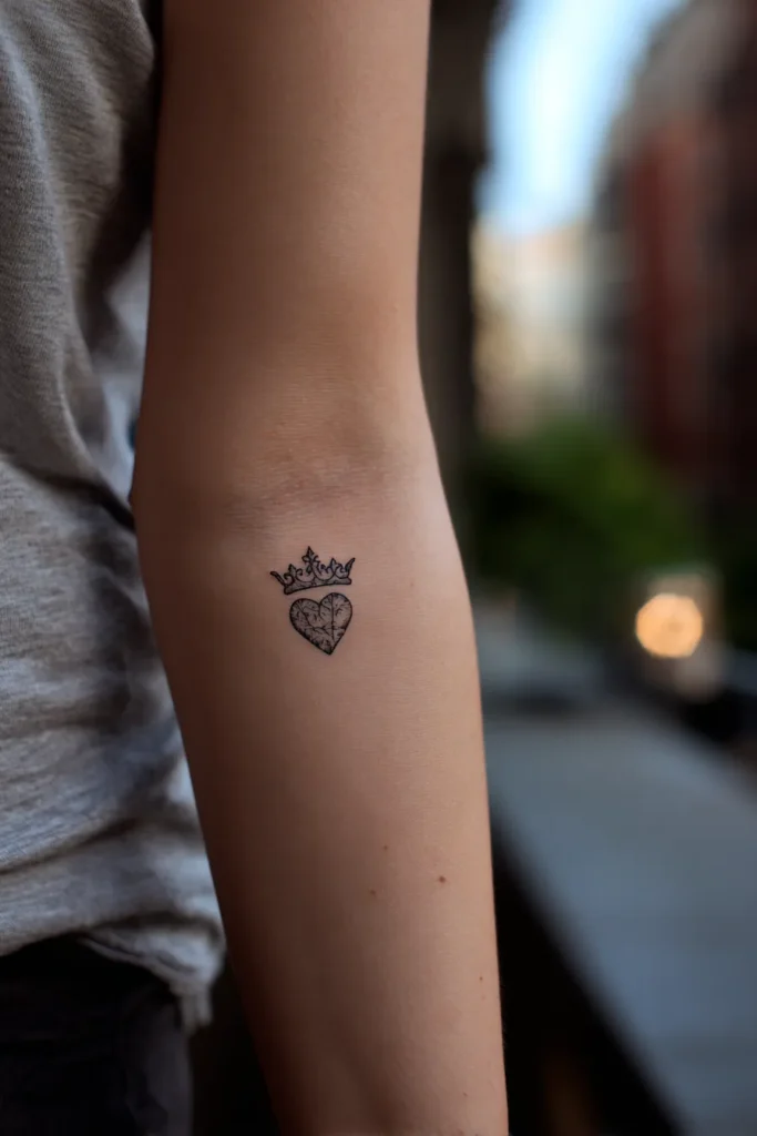 This small tattoo is placed on the inner arm and features a simple heart topped with a delicate crown. The fine line style keeps it clean and minimal, with soft black ink and subtle detailing inside the heart. Its size makes it easy to wear and the placement feels both visible and personal.