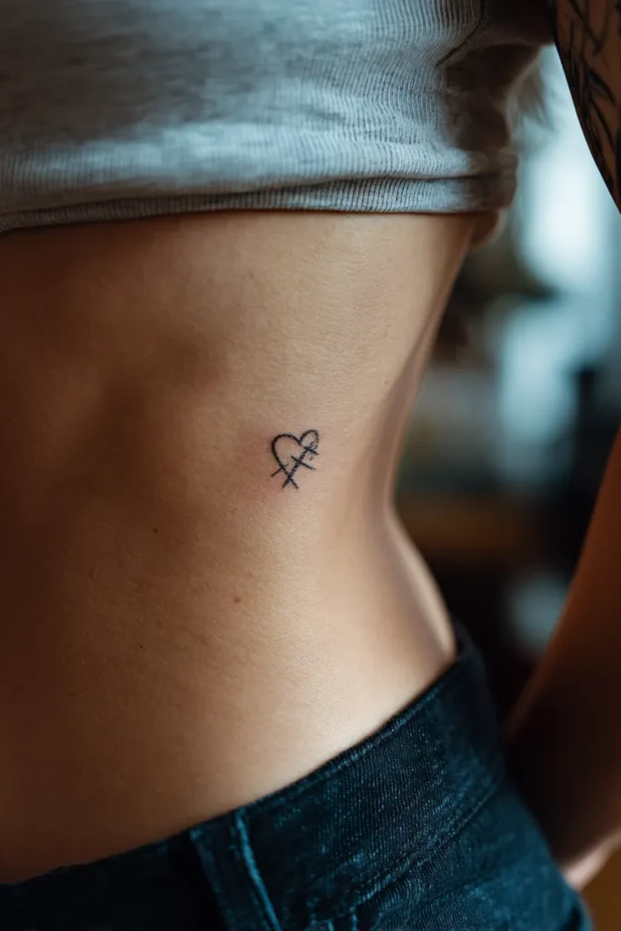 This tattoo rests on the side of the waist and features a small heart created with sketch like lines and a subtle cross stitch detail. The fine line black ink keeps it light and modern, while the placement adds a soft feminine touch. It feels intimate and almost handwritten in style.