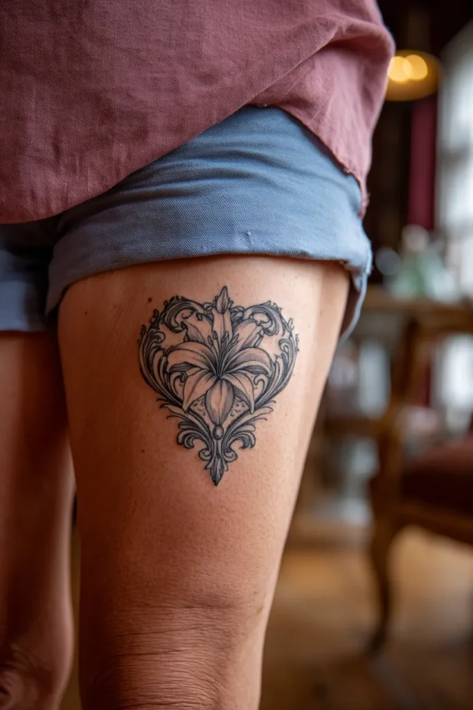 This tattoo sits beautifully on the outer thigh and features a heart shaped ornamental frame with a blooming lily at the center. The linework is detailed yet soft with gentle shading that gives the floral elements depth without feeling heavy. The black ink stays clean and balanced and the overall size feels bold but still feminine and wearable.
