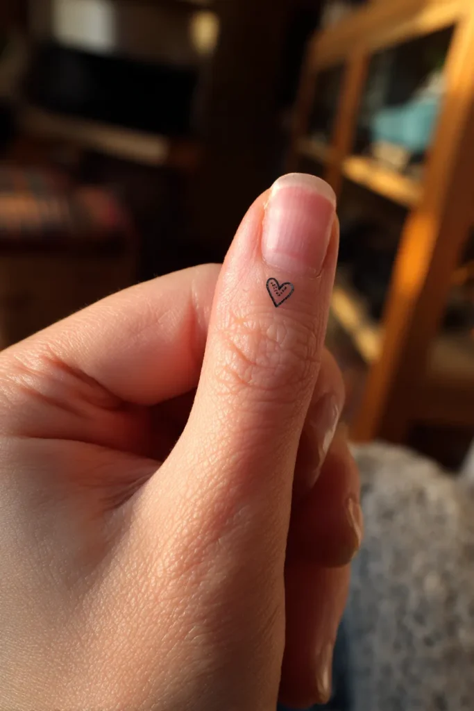 This delicate tattoo is placed right on the thumb near the nail and features a tiny outlined heart in black ink. The lines are thin and intentional and the size is incredibly minimal which makes it feel almost like a secret. It is simple clean and sits naturally with the shape of the finger.