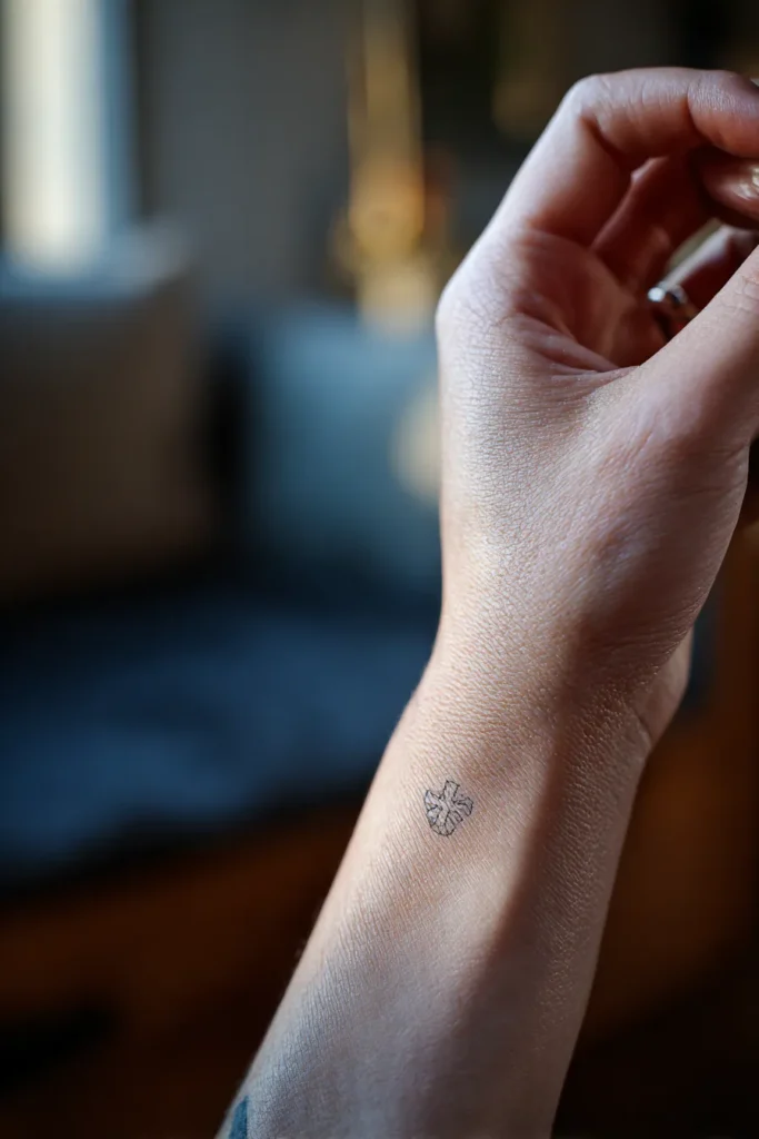 This ultra delicate tattoo sits on the inner wrist and features a miniature cross formed with soft floral inspired linework. The fine black ink creates a subtle outline that almost looks like petals gently shaping the cross, giving it a romantic and feminine feel. Its very small size makes it discreet and elegant, blending naturally with the skin while still clearly representing faith.