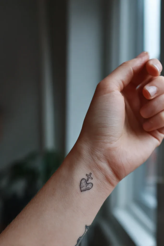 This delicate tattoo sits softly on the inner wrist and features a small hand drawn heart paired with a simple cross resting just above it. The lines are fine and slightly imperfect in a charming way, giving it an intimate and almost handwritten feel. Its small size makes it subtle and easy to wear, with black ink that blends beautifully into the natural skin tone without overpowering the area.