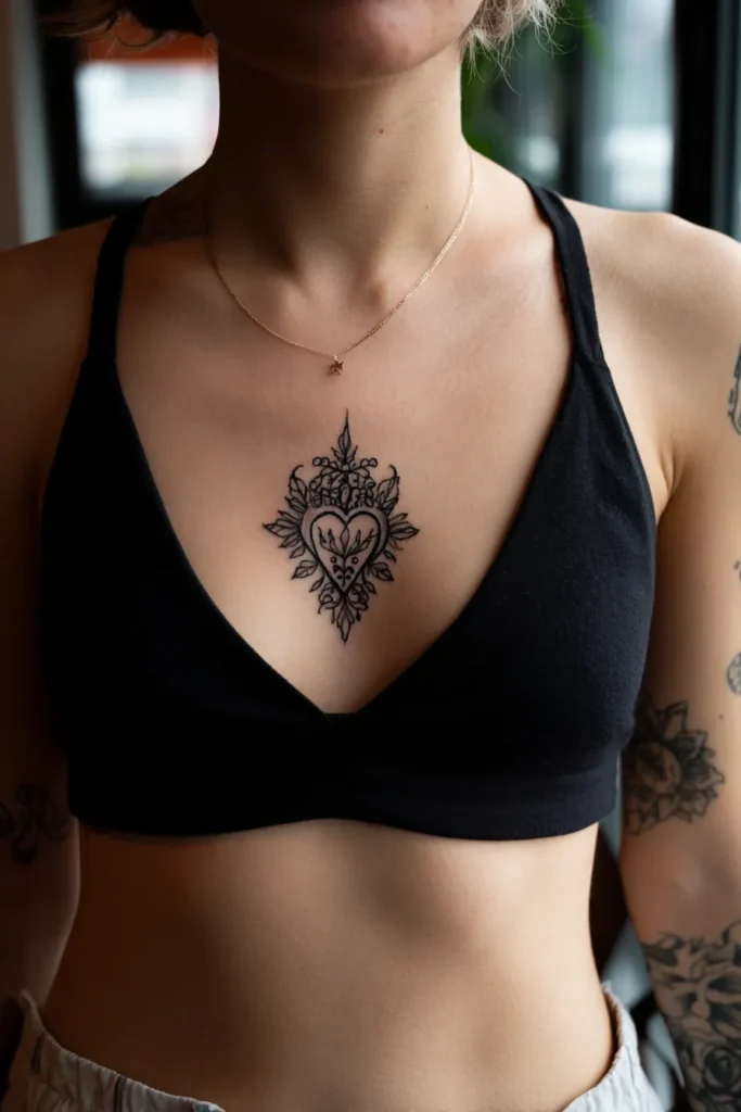 This tattoo sits right at the center of the chest and features a heart framed by intricate ornamental and botanical details. The black ink linework is elegant and symmetrical with fine lines that create a lace like effect. The placement makes it feel intentional and close to the heart both visually and emotionally.