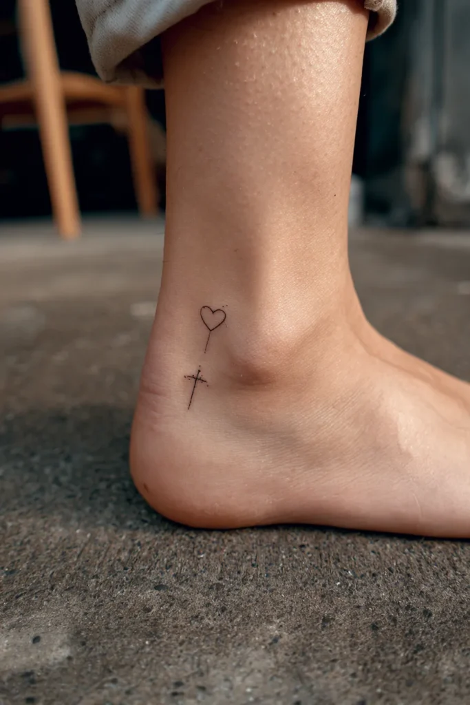 This dainty ankle tattoo features a tiny heart above a slender cross, both created with fine line black ink. The vertical alignment keeps the design light and balanced, while the small size allows it to sit naturally near the ankle bone. The simplicity of the lines gives it a soft and almost handwritten look.