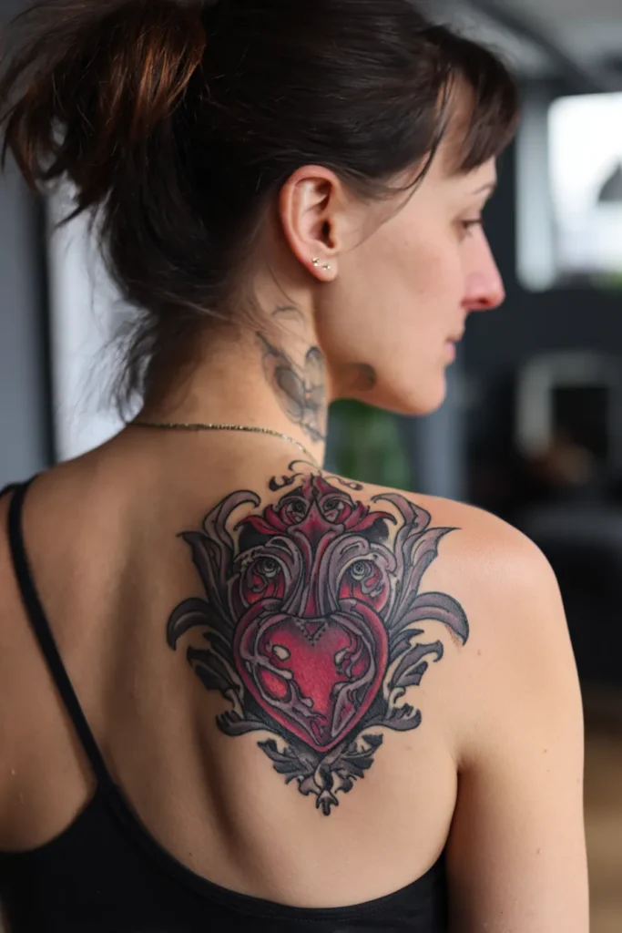 This striking tattoo is placed across the upper back and features a bold red heart surrounded by intricate ornamental shapes and flowing linework. The shading adds depth and dimension, while the rich red tones give the heart a powerful presence against the skin. The design feels symmetrical and intentional, making it a true centerpiece tattoo.