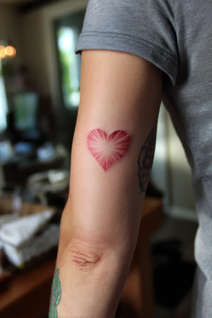 This tattoo is placed on the forearm and showcases a heart filled with radiant red lines that glow outward from the center. The soft gradient effect creates a luminous look, almost as if light is shining through the heart. The color choice adds warmth while still keeping the design clean and focused.