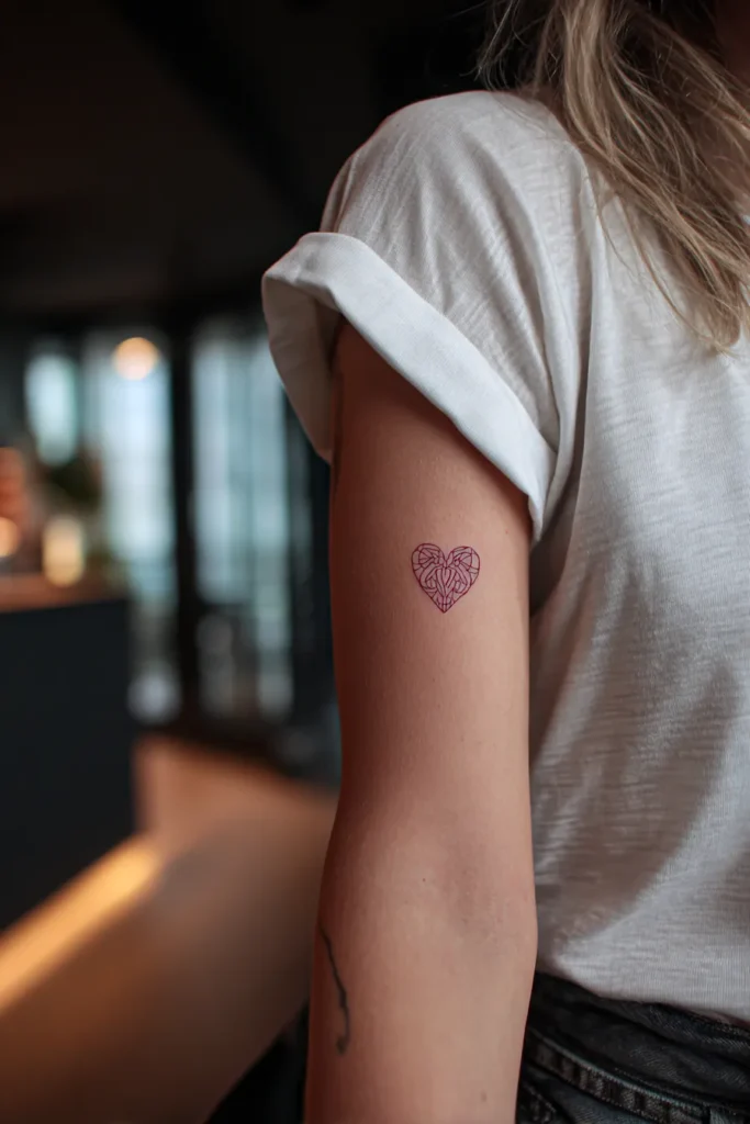 This delicate tattoo sits on the upper arm just below the sleeve line and features a small heart created with intricate fine line detailing inside the shape. The interior lines form an almost leaf like or vein inspired pattern, giving the heart a soft organic feel rather than a solid fill. The thin black ink keeps the design subtle and airy, making it blend naturally with the skin while still feeling intentional.