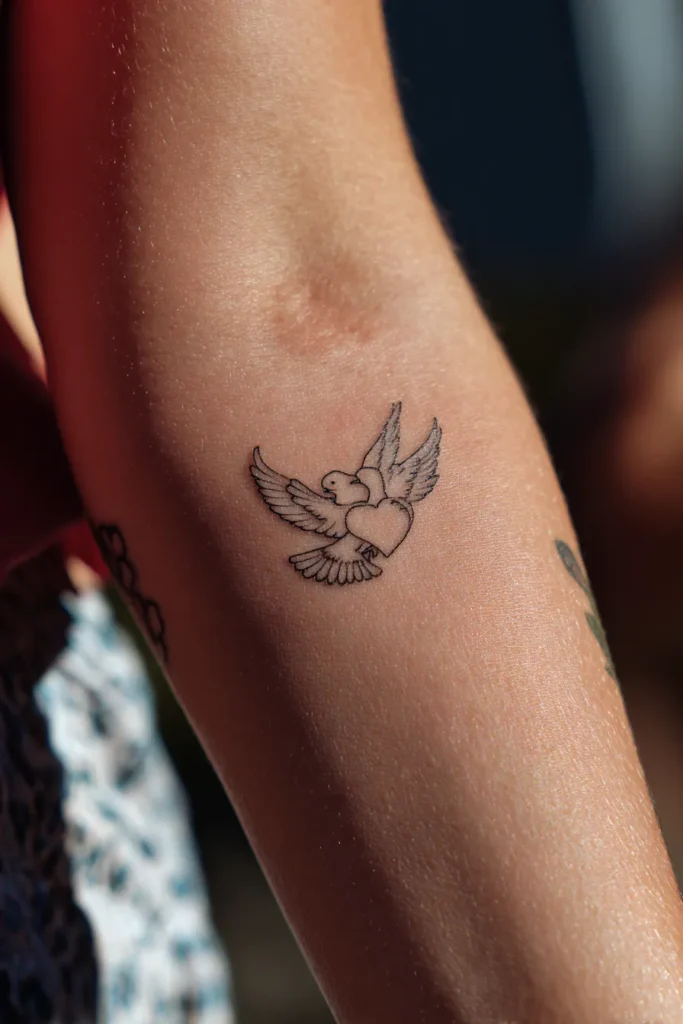 Placed along the inner forearm, this tattoo shows a dove in mid flight with its wings spread wide while gently holding a heart at its center. The line work is clean and fine, with soft detailing in the texture of the wings that adds movement without feeling heavy. The heart blends seamlessly into the design, creating a balanced and graceful symbol in classic black ink.