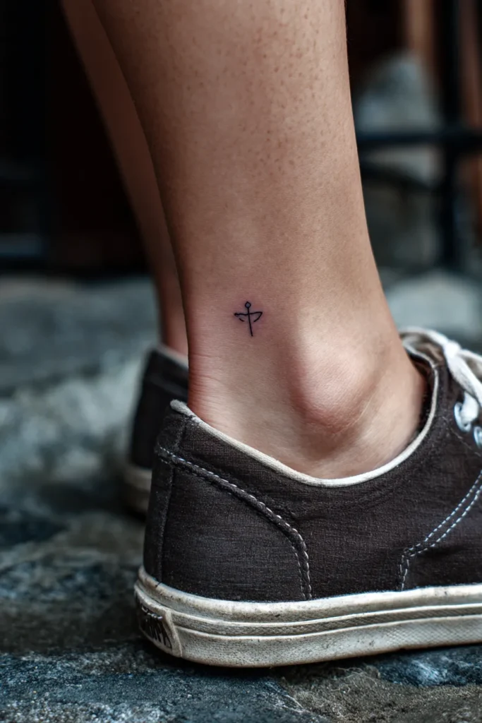 This tiny cross tattoo is placed just above the ankle bone, making it discreet yet intentional. The design is extremely minimal, created with fine black lines and a clean silhouette that doesn’t include any extra embellishment. Its small size allows it to sit naturally on the ankle, almost like it has always belonged there.
