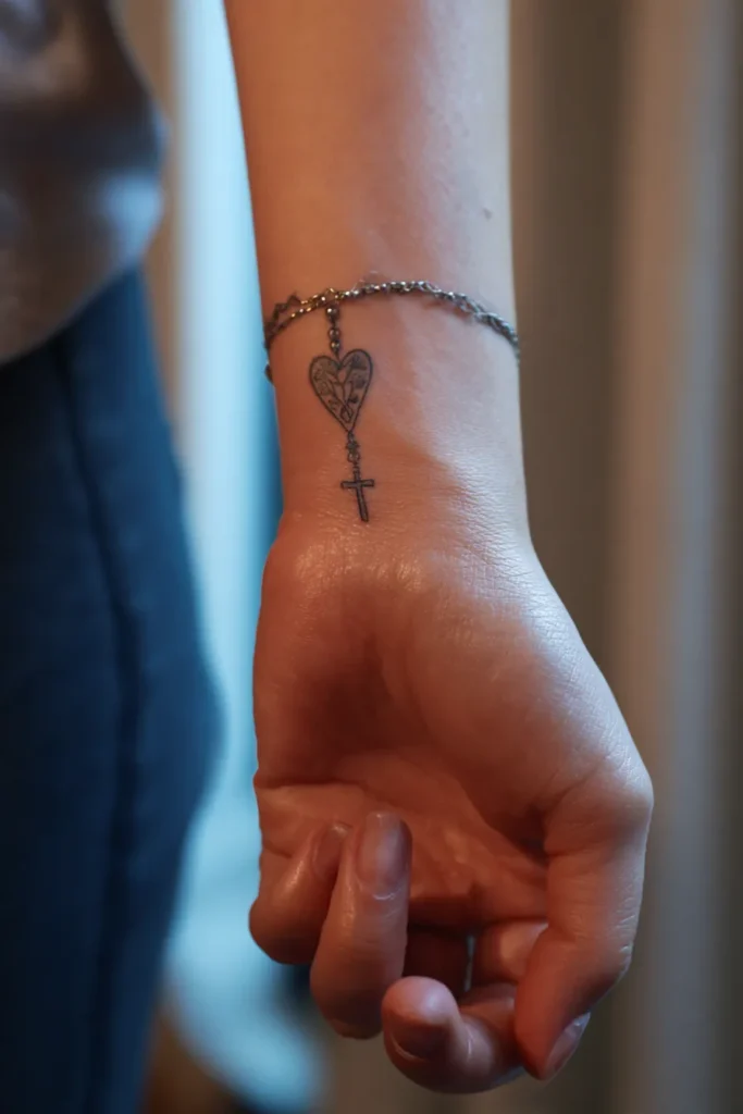 This tattoo wraps beautifully around the wrist like a delicate bracelet, featuring a heart shaped centerpiece connected to a rosary style chain and a small dangling cross. The fine line detailing gives it the look of real jewelry, with soft curves and gentle shading that keep it light and feminine. The placement makes it feel intentional and ornamental without looking bulky.