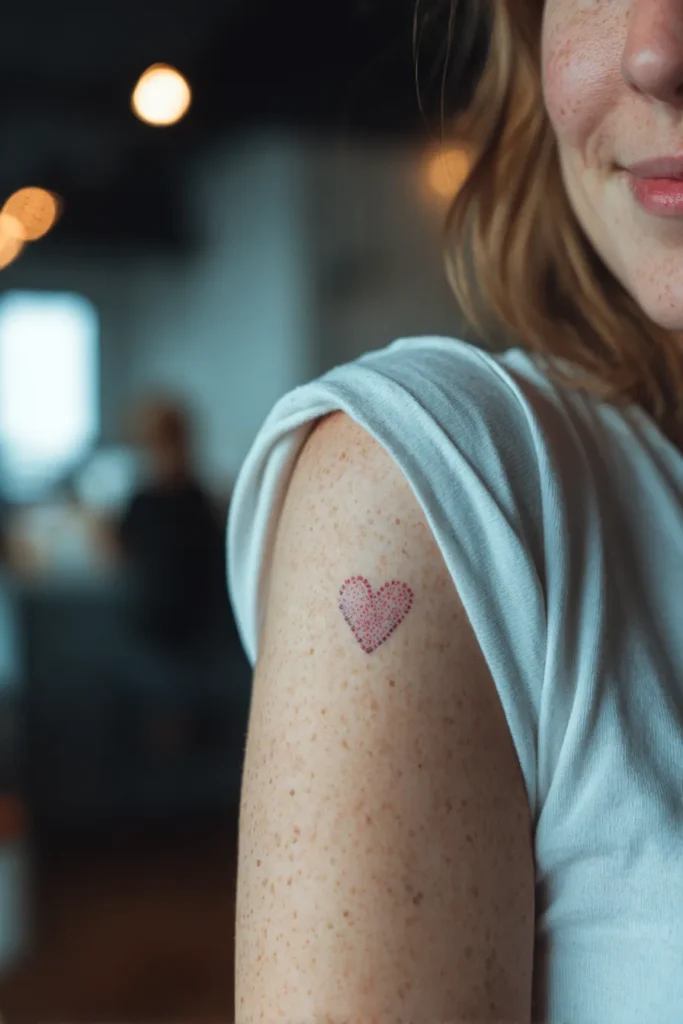 This tattoo features a small heart created with delicate dotwork placed on the upper arm near the shoulder. The design is simple and airy with tiny red dots forming the heart shape, giving it a light almost whispered look against the skin. The size is subtle and understated which makes it feel very personal and easy to wear every day without drawing too much attention.