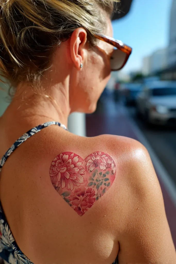This heart tattoo sits beautifully across the upper back and shoulder blade, filled with soft floral details in pink and muted red tones. The heart shape is clearly defined but the flowers inside give it a romantic and almost painterly feel. The placement allows the design to flow naturally with the shoulder which makes it feel graceful and intentional.
