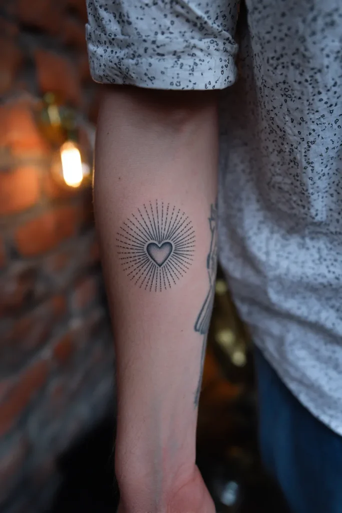 This design shows a small heart at the center of fine radiating lines placed on the inner forearm. The black ink keeps it clean and minimal while the sunburst effect around the heart adds a sense of light and energy. The overall look is balanced and modern with a spiritual undertone that feels very intentional.