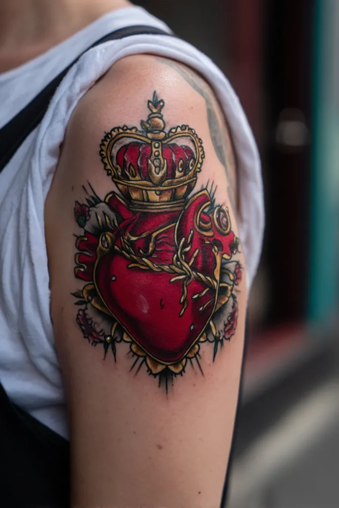 This tattoo is a bold sacred heart design placed on the upper arm featuring deep red tones a crown on top and thorn details wrapping around the heart. The shading and line work give it a classic traditional feel while still looking fresh and powerful. The size makes it a statement piece that clearly holds deep significance.