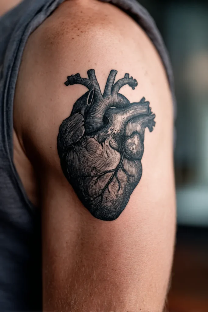 This tattoo features a detailed anatomical heart placed on the upper arm near the shoulder, rendered in fine black ink with intricate linework and subtle shading. The design feels realistic and expressive, with visible veins and contours that give it depth while still keeping a refined artistic style. Its medium size allows the heart to stand out without overwhelming the arm, making it a bold yet wearable piece.