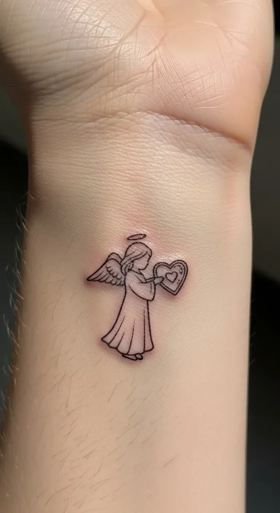 This dainty fine-line tattoo sits perfectly on the inner wrist and features a small, minimalist angel in profile. The design uses clean black ink work with delicate linework to define the angel’s flowing robe, feathered wings, and tiny floating halo. The focal point is the small heart being held carefully in the angel’s hands, which adds a sweet touch of detail without making the piece feel crowded. Its small scale makes it an ideal choice for someone looking for a subtle yet permanent tribute that can be easily tucked away or shown off.
