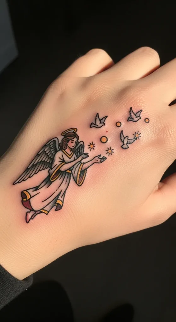 This piece features a classic angel figure gracefully releasing a trio of white doves across the back of the hand. The artwork uses bold black outlines and a warm color palette of gold, deep red, and soft cream to give it a vintage charm. Small golden sunbursts and circles float between the angel and the birds to add a sense of magic and movement. The placement is bold yet delicate, covering the area from the wrist toward the knuckles with clean lines that stand out beautifully against the skin.