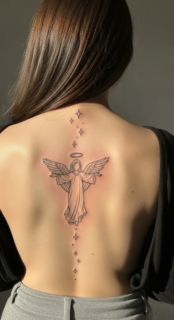 This piece features a delicate, fine line angel centered perfectly between the shoulder blades with a trail of sparkling four-pointed stars flowing vertically down the spine and up toward the neck. The design is done entirely in clean black ink with subtle shading in the folds of the angel’s robes, which gives it a nice sense of movement. It’s a medium-sized tattoo that uses the natural curve of the back to create a balanced, symmetrical look, while the open face of the angel keeps the vibe airy and mysterious.
