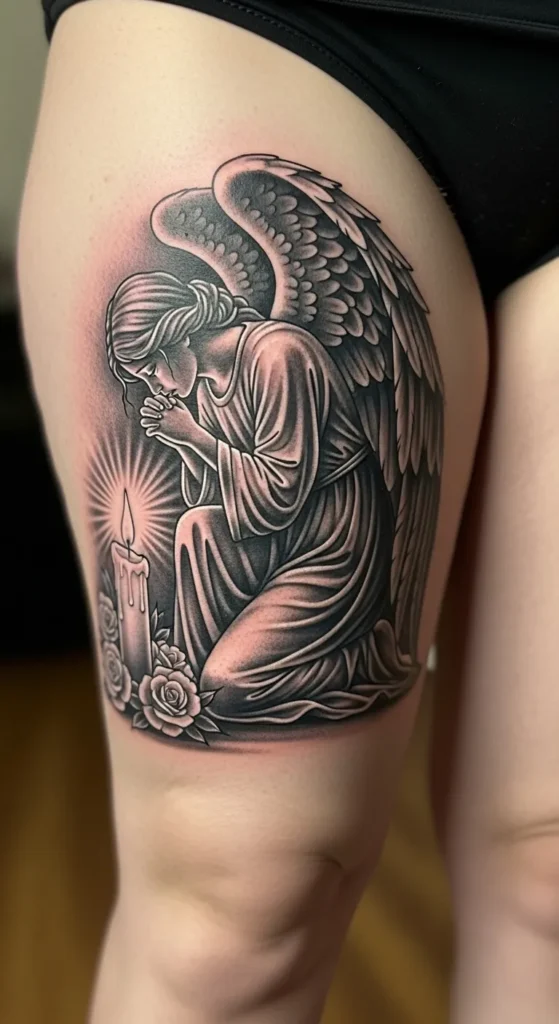 This large black and grey piece on the upper thigh is a stunning example of classic shading and deep symbolism. The tattoo showcases a beautiful angel in a humble kneeling position with her hands clasped in prayer. Beside her sits a lit candle that casts a bright glow through fine line work rays, while a few delicate roses rest at the base. The use of negative space for the highlights on her robes and the candle flame creates a striking contrast against the soft stippled background. It occupies a significant portion of the leg, which allows for incredible detail in the feathers of the wings and the gentle expression on the angel’s face.