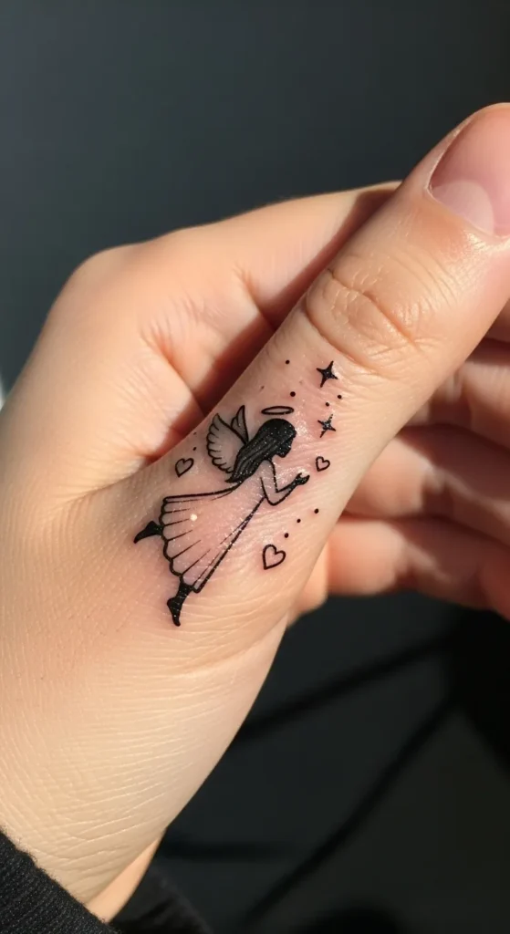 This tiny tattoo finds a perfect home on the side of the thumb and captures a whimsical little angel in mid-flight. It uses clean black ink with a mix of solid fills for the hair and boots and delicate linework for the pleated dress and wings. The composition is sprinkled with tiny hearts and sparkling stars that seem to drift from the angel’s hands. It is a small-scale piece, but the contrast of the dark ink against the skin makes every little detail pop beautifully without needing any extra color.