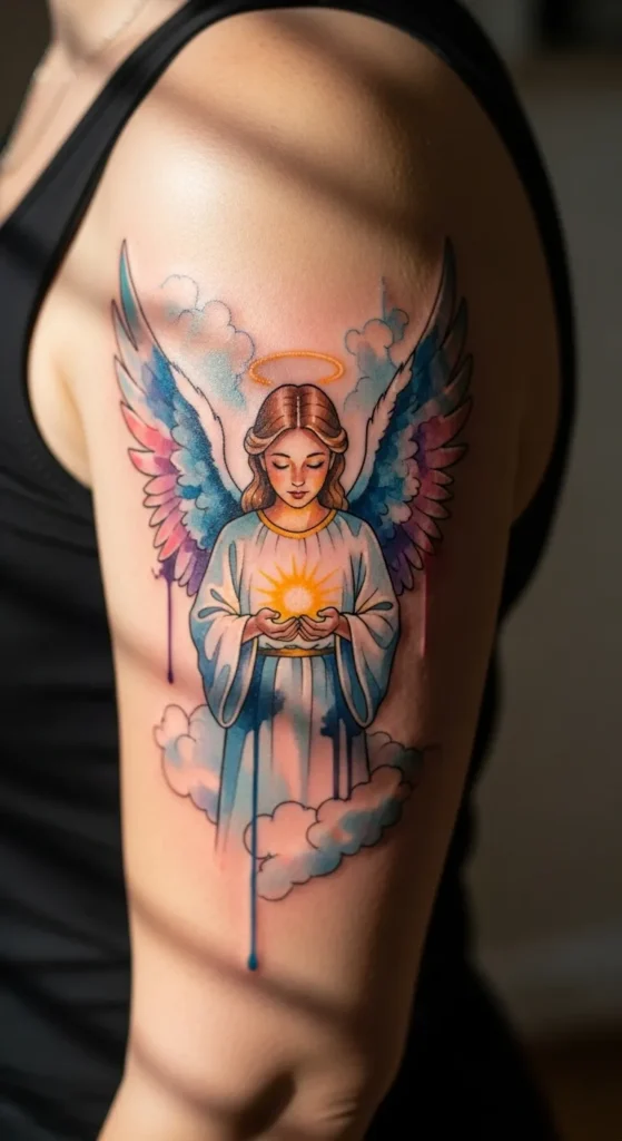 This vibrant upper arm tattoo showcases a beautiful female angel cradling a glowing sun between her hands. The piece blends clean black outlines with a dreamy watercolor technique where splashes of sky blue, soft violet, and rosy pink bleed past the edges of the wings. Sitting at a medium size that fills the shoulder perfectly, the design includes delicate details like a golden halo and fluffy clouds at the base. The most unique touch is the intentional blue ink drips that trail down the arm, giving the whole image a fresh, artistic feeling that looks like a painting come to life on the skin.