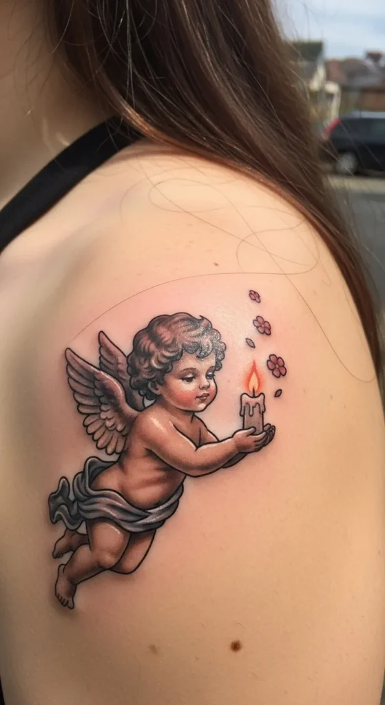 This shoulder piece showcases a sweet cherub in a classic neo-traditional style with smooth shading and crisp outlines. It’s is a medium-sized tattoo that fits perfectly on the upper back or shoulder blade area. The angel is depicted in mid-air with soft brown curls and rosy cheeks while holding a glowing candle with a bright orange flame. Tiny pink blossoms drift around the candlelight, which adds a delicate touch of color against the warm skin tones of the figure. The use of white ink highlights on the wings and the melting wax gives the whole design a polished and three-dimensional look.