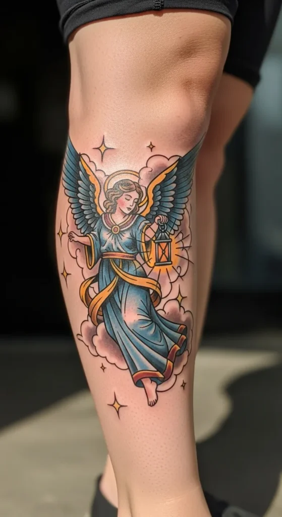 This stunning piece sits perfectly on the back of the calf and captures a classic American Traditional vibe. The medium-sized design showcases an angel draped in flowing teal and gold robes, floating among soft pink clouds and twinkling gold stars. The bold black linework gives it that timeless tattoo look, while the rich color palette of deep blues and warm yellows makes the whole image pop against the skin. I especially like the way the lantern glows with a bright orange hue because it adds such a focal point to the artwork.
