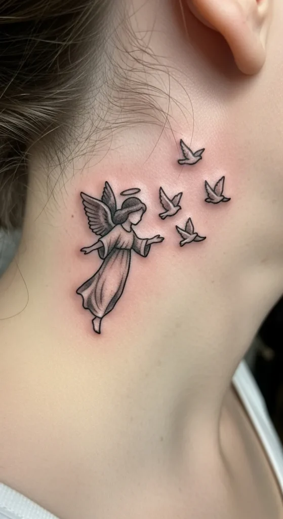 This tattoo rests beautifully right behind the ear on the side of the neck. It uses a clean black and gray style with bold outlines and soft shading to give the angel a timeless look. The size is perfect for the space, showing a faceless angel with her arms open as four small doves fly toward the sky. The shading on her gown and wings adds just enough depth without making the piece feel heavy or cluttered. It keeps the focus on the movement of the birds and the peaceful posture of the angel.