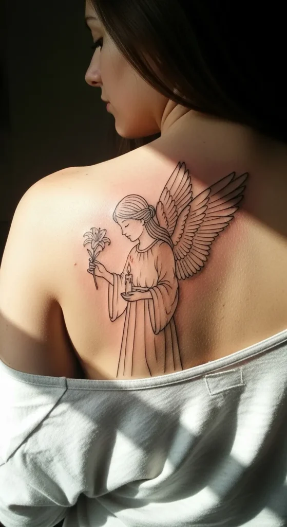This fine-line tattoo sits beautifully on the upper back and shoulder blade area. It uses clean and crisp black ink to depict a serene angel in profile. The design is fairly large and spans most of the right shoulder. You can see the intricate detail in the layered feathers of the wings and the gentle folds of the angel’s robe. She is holding a delicate lily in one hand and a lit candle in the other. Both are powerful symbols of peace and memory. The lack of heavy shading keeps the look light and airy, even though it covers a significant amount of skin.