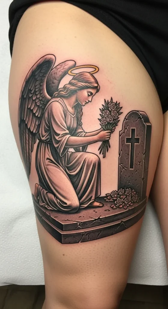 This thigh tattoo captures a deeply moving scene in a classic Neo-traditional style. The design shows a sorrowful angel kneeling on a stone plinth while offering a bouquet of roses to a headstone marked with a simple cross. It is a large and impactful piece that uses a sophisticated palette of muted greys and sepia tones. The only pop of color comes from the thin gold halo that glows above the angel’s head. Every detail is crisp and intentional, from the delicate feathers in her wings to the tiny cracks in the weathered stone base.