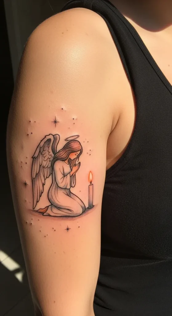 This upper-arm tattoo features a serene kneeling angel in a soft, illustrative style. The piece is medium-sized and relies on delicate black outlines with subtle gray shading to give the angel’s robes and wings a sense of movement. A warm touch of orange and yellow brings the glowing candle flame to life, while tiny black dots and fine-line stars create a mystical atmosphere around the figure. The placement on the outer bicep allows the angel to follow the natural curve of the shoulder, which makes the whole design feel balanced and intentional.
