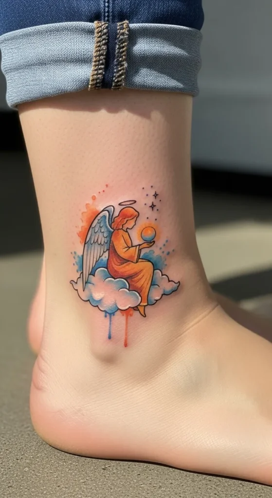 This ankle tattoo brings a splash of life and color to a very personal tribute. The design showcases a small angel in a flowing orange robe sitting peacefully atop a fluffy blue and white cloud. It uses a watercolor technique where the edges look like wet paint splashes with playful drips of blue and orange running down toward the heel. The angel holds a glowing golden orb while tiny black stars twinkle above. It is a compact piece that fits perfectly just above the ankle bone and uses bright, contrasting tones to make the imagery pop against the skin.