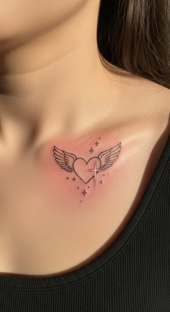 This delicate, fine-line piece sits beautifully right below the collarbone, where it can be easily shown off or tucked away. The design features a perfectly symmetrical heart at the center with soft, feathered wings stretching out on either side. A glowing four-pointed star that doubles as a cross overlaps the heart while tiny twinkles and dots dance around the edges. It is all done in a super clean black ink style that keeps the look fresh and light without feeling heavy on the skin.