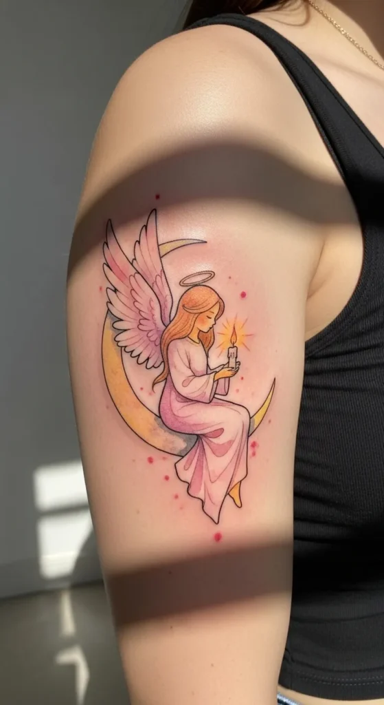 This upper-arm tattoo showcases a peaceful angel seated comfortably on a crescent moon. The piece uses a fine-line approach with a soft pastel palette of blush pinks and golden yellows. It is a medium-sized design that fills the space beautifully without feeling heavy. Every detail is carefully considered, from the soft glow radiating from the single candle to the tiny pink sparkles floating in the air around the figure. The halo sits lightly above her head while her wings display a gentle gradient of pink and white.