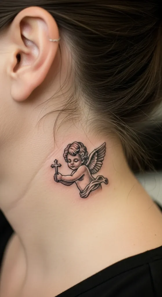 Cherub with Cross Neck Tattoo
